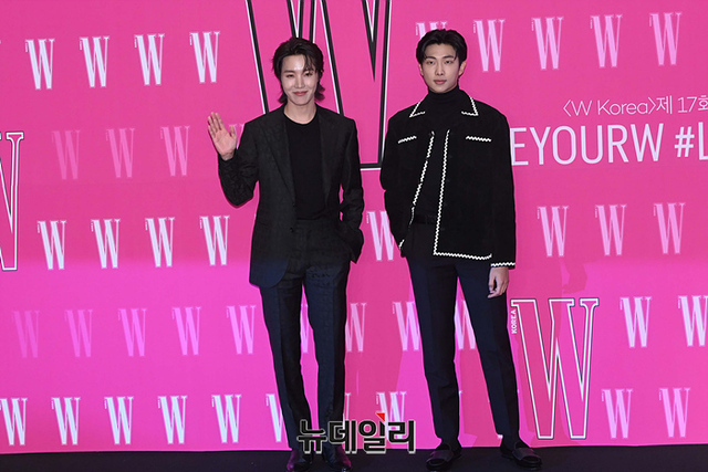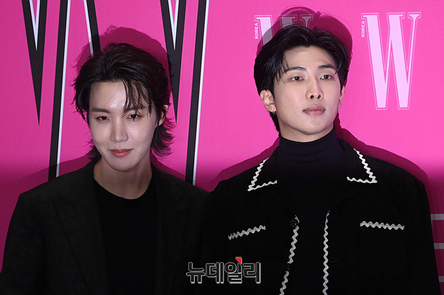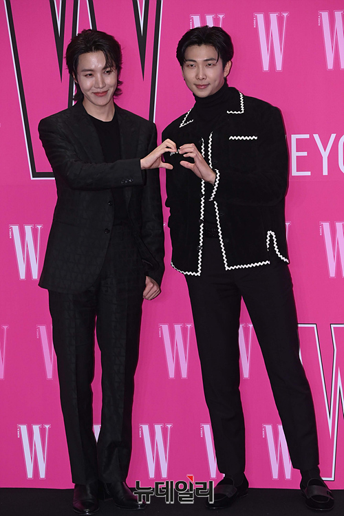 방탄소년단(BTS) 멤버 제이홉과 RM(오른쪽)이 28일 오후 서울 종로구 포시즌스 호텔에서 패션 매거진 '더블유 코리아' 주최로 열린 '제17회 유방암 인식 향상 캠페인 자선 행사'에서 포즈를 취하고 있다.