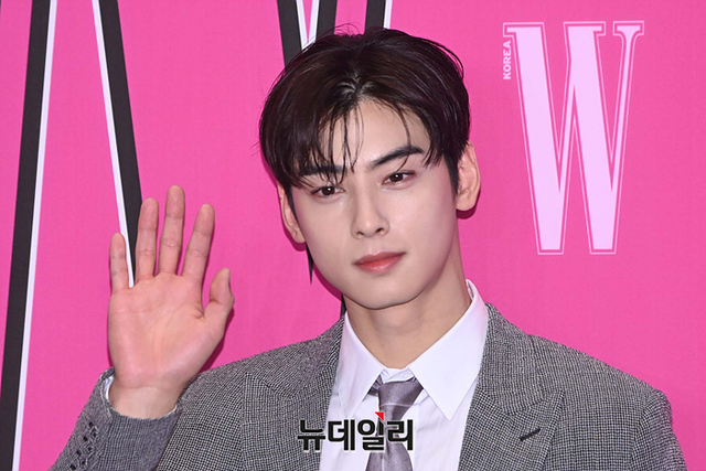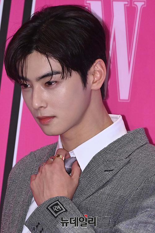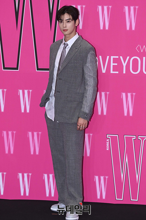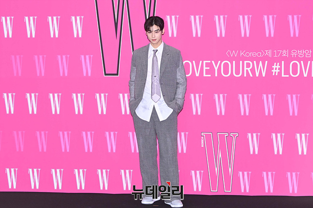 가수 차은우가 28일 오후 서울 종로구 포시즌스 호텔에서 패션 매거진 '더블유 코리아' 주최로 열린 '제17회 유방암 인식 향상 캠페인 자선 행사'에서 포즈를 취하고 있다.