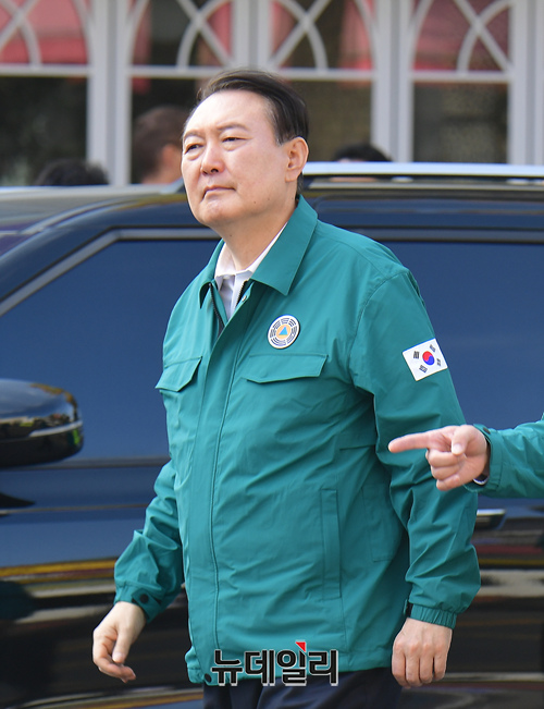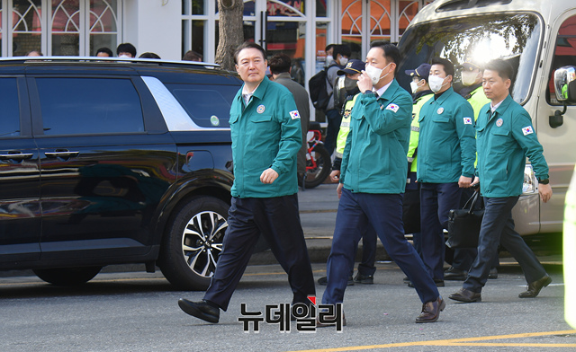 핼러윈을 앞두고 이태원 일대에 대형 압사 참사가 발생한 30일 서울 용산구 이태원 사고현장을 윤석열 대통령이 둘러보고 있다.