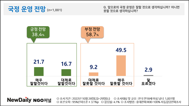 국정운영 전망에서는 '긍정 전망'은 38.4%, '부정 전망'은 58.7%로 집계됐다. 현재 국정운영보다 향후 국정운영 전망에서 긍정 응답이 1.9%p 소폭 높았다.지역별로 살펴보면 △서울 긍정 42.7%, 부정 54.5% △경기·인천 긍정 33.3%, 부정 62.2% △대전·세종·충남·충북 긍정 44.8%, 부정 54.3% △광주·전남·전북 긍정 23.4%, 부정 74.6% △대구·경북 긍정 50.8%, 부정 45.5% △부산·울산·경남 38%, 부정 59.3% △강원·제주 긍정 40.9%, 부정 54.5%였다.연령대별로는 △만18세~20대 긍정 전망 26.9%, 부정 전망 67.6% △30대 긍정 전망 38.1%, 부정 전망 57.9% △40대 긍정 전망 30.2%, 부정 전망 69.4% △50대 긍정 전망 33.3%, 부정 전망 62.9% △60세 이상 긍정 전망 53.3%, 부정 전망 44.8%로 집계됐다.성별로는 △남성 긍정 전망 34.1%, 부정 전망 64%△여성 긍정 전망 42.6%, 부정 전망 53.5%로 나타났다.이념 성향별로는 △우파 긍정 전망 76.3%, 부정 전망 23.3%였으며 △좌파 긍정 전망 10.9%, 부정 전망 87.5%였다. 중도층은 긍정 전망 29.5%, 부정 전망 66.8%로 집계됐다.지지 정당별로 국민의힘 지지층의 경우 긍정 전망 84%, 부정 전망 15.4%였고, 더불어민주당 지지층에서는 긍정 전망 6.3%, 부정 전망 92.2%로 나타났다.
