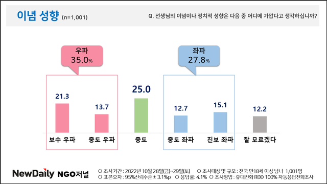 중도층 21%대 감소… 이념 성향 변화여론조사 응답자를 이념 성향별로 보면 △우파 35%(보수 우파 21.3%+중도 우파 13.7%) △좌파 27.8%(진보좌파 15.1%+중도좌파 12.7%)로 조사됐다. 중도층의 경우 25%였으며 '잘 모르겠다'는 12.2%였다.지난 주 조사와 비교해 우파라는 응답은 14%, 좌파는 6.3% 증가했으며 중도층은 21.6% 감소했다.지역별로는 △서울 우파 39.2, 좌파 20.6%, 중도 28.1% △경기·인천 우파 33.7%, 좌파 30.8%, 중도 23.9% △대전·세종·충남·충북 우파 37.6%, 좌파 27.6%, 중도 24.5% △광주·전남·전북 우파 12.3%, 좌파 42%, 중도 29.3% △대구·경북 우파 46.1%, 좌파 20%, 중도 25.1% △부산·울산·경남 우파 38.7%, 좌파 23.6%, 중도 23.4% △강원·제주 우파 31.6%, 좌파 38.7%, 중도 16.6%였다.연령대별로는 △만18세~20대 우파 32.2%, 좌파 26.3% 중도 29.1% △30대 우파 35.6%, 좌파 30%, 중도 27.8% △40대 우파 30.1%, 좌파 40%, 중도 21.4% △50대 긍정 전망 우파 29.5%, 좌파 28.6%, 중도 29.8% △60세 이상 우파 43.7%, 좌파 19.6%, 중도 20.4%로 집계됐다.성별로는 △남성 우파 37.4%, 좌파 29.7%, 중도 26.7% △여성 우파 32.6%, 좌파 26%, 중도 23.4%로 나타났다.이번 조사는 자동응답 전화조사(무선 RDD 100%) 방식으로 진행됐고 최종 응답률은 4.1%다. 표본오차는 95%에 신뢰수준 ±3.1%p다. 여론조사의 자세한 개요와 결과는 중앙선거여론조사심의위원회 홈페이지를 참고하면 된다.