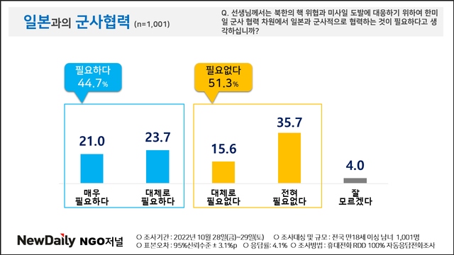 '일본과의 군사협력' 이념성향에 따라 응답 차이같은 조사에서 '일본과의 군사협력이 필요하느냐'는 질문에는 51.3%는 '필요없다', 44.7%는 '필요하다'고 답했다. '잘 모르겠다'는 4%였다.지역별로는 △서울 '필요하다' 45.4%, '필요없다' 50.5% △경기·인천 '필요하다' 45.2%, 필요없다 '50.4% △대전·세종·충남·충북 '필요하다' 45.1%, '필요없다' 48.3%, △대구·경북 '필요하다' 49.3%, '필요없다' 47.6% △부산·울산·경남 '필요하다' 45.8%, '필요없다' 52.2% △강원·제주 '필요하다' 37.9%, '필요없다' 59.8%로 집계됐다.연령별로는 △만18세~20대 '필요하다' 45.5%, '필요없다' 53.2% △30대 '필요하다' 45.8%, '필요없다' 49.6% △40대 '필요하다' 31.9%, '필요없다' 65.4% △50대 '필요하다' 37.5%, '필요없다' 59.9% △60세 이상 '필요하다' 56.1%, '필요없다' 36.8%로 나타났다.성별로 보면, 남성은 41.9%가 '필요하다', 56.5%가 '필요없다'고 답한 반면 여성은 47.4%가 '필요하다', 46.2%가 '필요없다'고 답했다.지지하는 정당에 따라서도 응답이 달랐다. 민주당 지지층은 80%가 '필요없다', 16.9%가 '필요없다'고 응답했으나 국민의힘 지지층은 80.3%가 '필요하다', 15.7%가 '필요없다'고 했다.