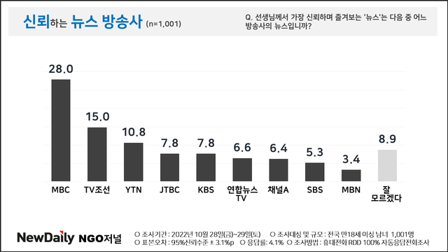 '신뢰하는 뉴스 방송사' MBC·TV조선·YTN 순해당 여론조사에서 가장 신뢰하는 뉴스 방송사로 MBC(28%)를 꼽은 응답자가 가장 많았다. 뒤를 이어 TV조선(15%), YTN(10.8%), KBS·JTBC(7.8%), 연합뉴스TV(6.6%), 채널A(6.4%), SBS(5.3%), MBN(3.4%)순이었다. '잘 모르겠다'는 응답은 8.9%였다.지역별로 보면 모든 지역에서 MBC가 가장 신뢰를 받고 있는 것으로 나타났다. 연령별 조사에서도 60세 이상(TV조선 22.1%, MBC 18.7%)을 제외하고는 MBC 신뢰도가 높았다.다만 이념 성향에 따라서는 응답 차이가 컸다. 우파의 경우 TV조선(36.6%)를 가장 신뢰했으며, 좌파의 경우 MBC(54.1%)를 가장 신뢰하는 것으로 나타났다.이번 조사는 자동응답 전화조사(무선 RDD 100%) 방식으로 진행됐고 최종 응답률은 4.1%다. 표본오차는 95%, 신뢰수준은 ±3.1%p였다. 여론조사의 자세한 개요와 결과는 중앙선거여론조사심의위원회 홈페이지를 참고하면 된다.