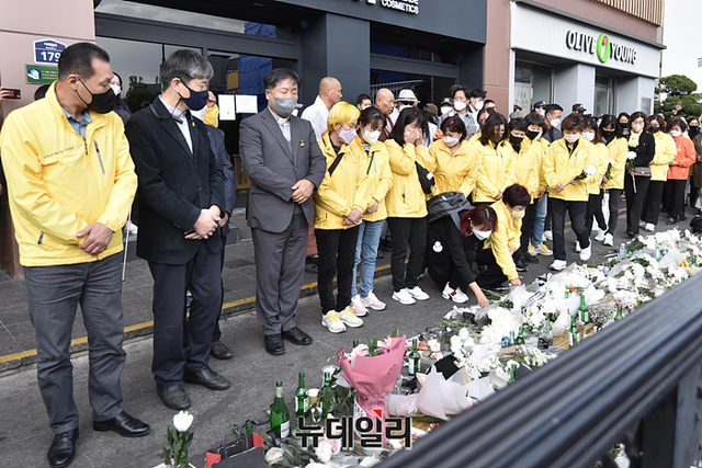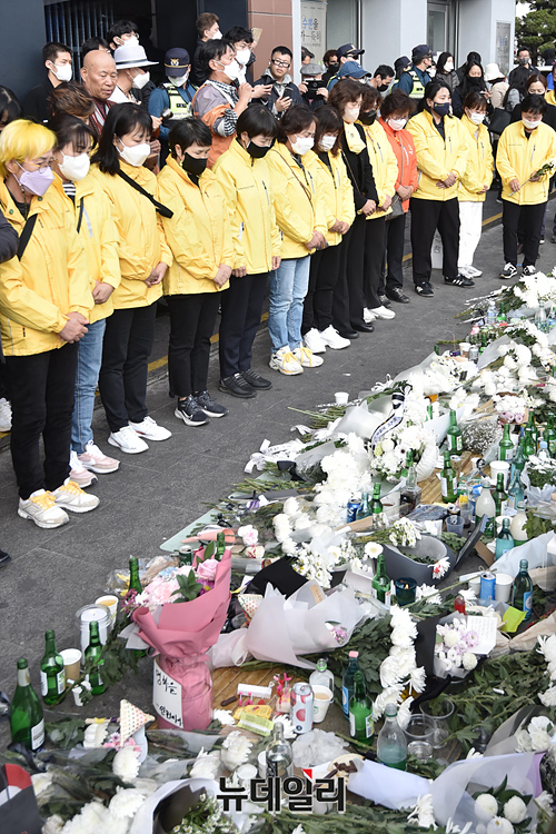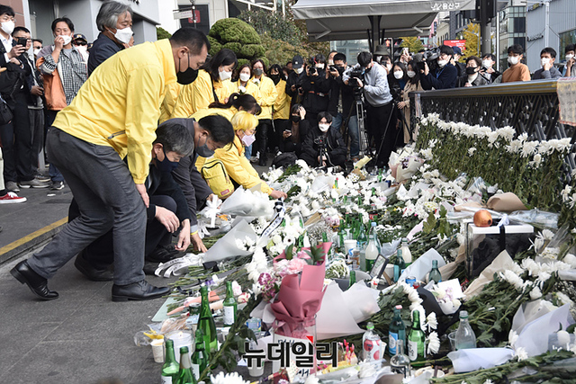 '이태원 압사사고' 현장에 마련된 추모공간을 찾은 4·16세월호참사가족협의회를 비롯한 4·16재단 등 유가족들이 31일 오후 서울 용산구 이태원역 인근에서 희생자들을 추모하고 있다.