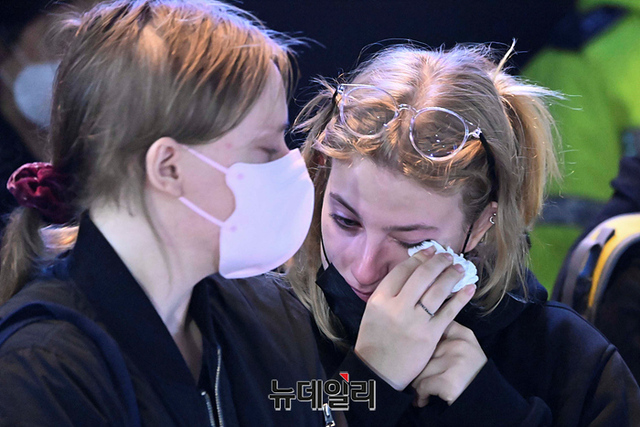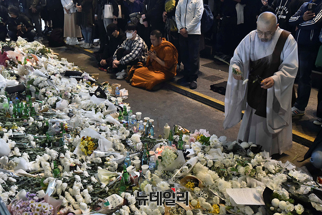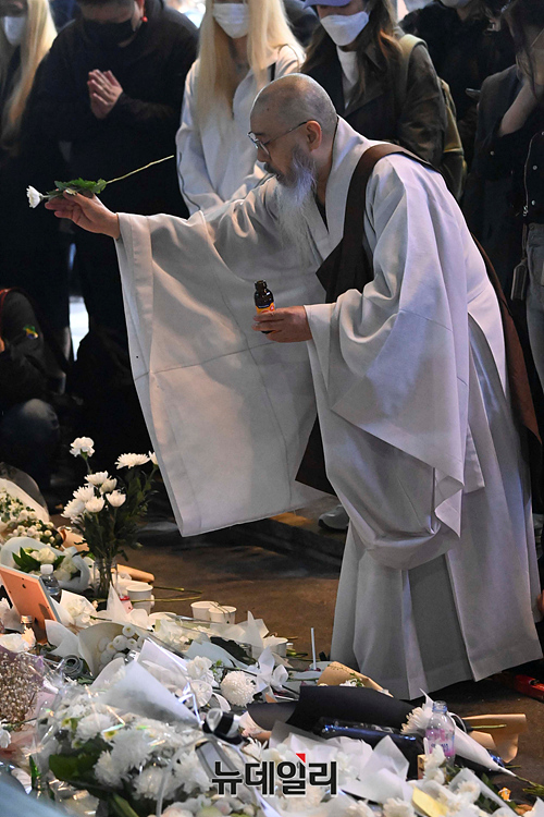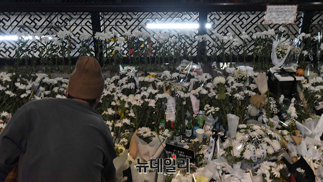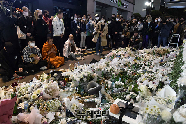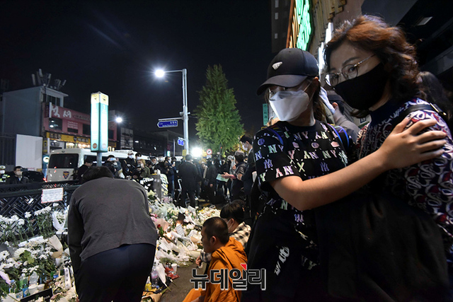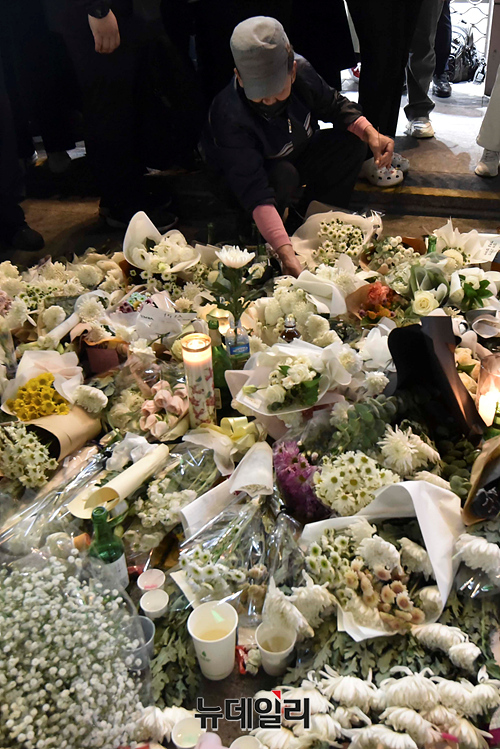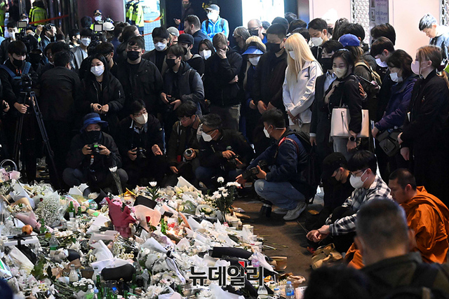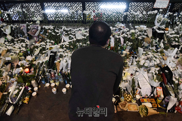 '이태원 압사 사고' 현장에 마련된 추모공간을 찾은 조문객들이 31일 오후 서울 용산구 이태원역 인근에서 희생자들을 추모하고 있다. 정부는 11월 5일까지 국가 애도 기간으로 지정했다.