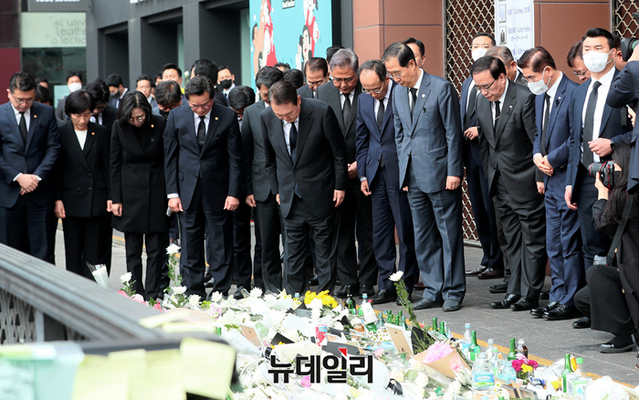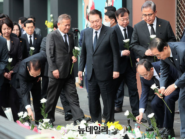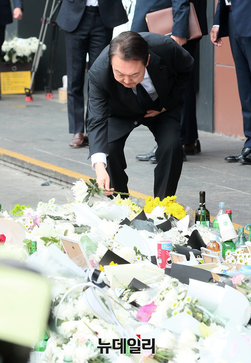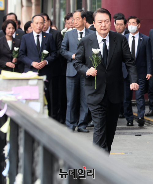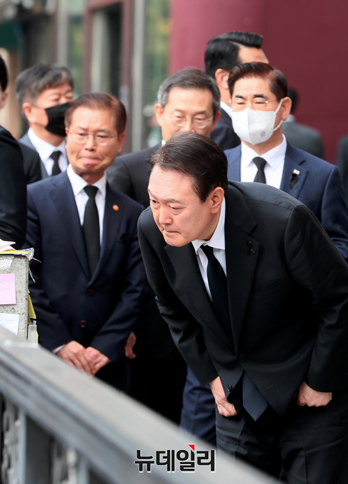 윤석열 대통령이 1일 오전 서울 용산구 이태원역 1번 출구 앞에 마련된 '이태원 압사사고' 추모 공간을 찾아 현장을 둘러보고 있다. 정부는 11월 5일까지 국가 애도 기간으로 지정했다.