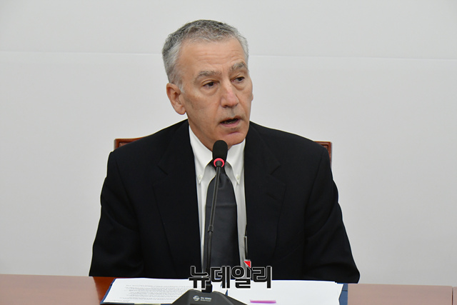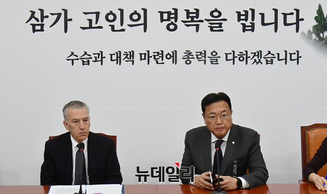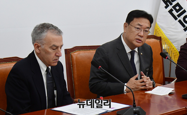 정진석 국민의힘 비상대책위원장이 1일 오전 국회를 찾은 필립 골드버그 주한미국대사와 대화를 나누고 있다.