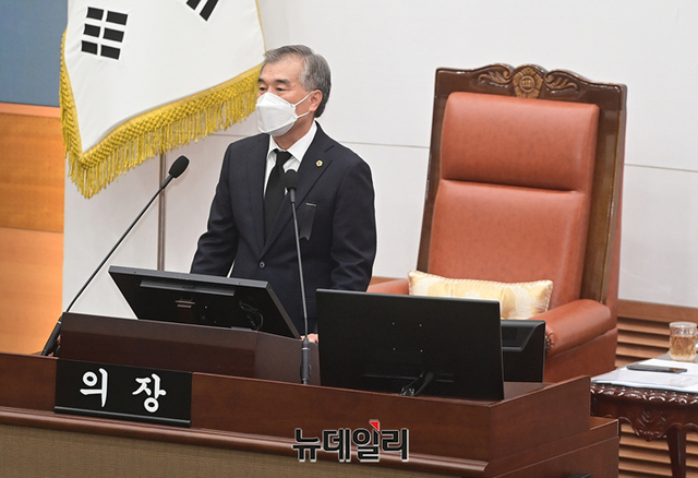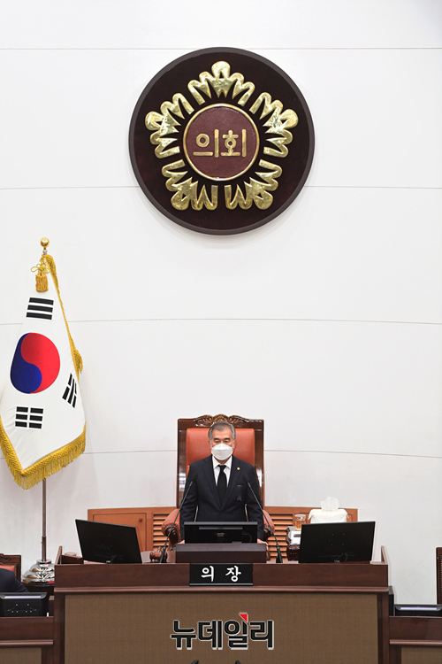 김현기 서울시의회 의장이 1일 오후 서울시의회 본회의장에서 열린 제315회 정례회 제1차 본회의 개회를 알리고 있다. 김 의장은 이날 이태원 사고와 관련해 서울시의회를 대표해 사과했다. 본회의에 앞서 사망자에 대한 묵념을 하기도 했다.