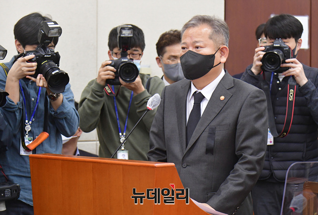 이상민 행정안전부 장관이 1일 오후 국회에서 열린 행정안전위원회 전체회의에서 이태원 참사 현안 보고를 하고 있다.