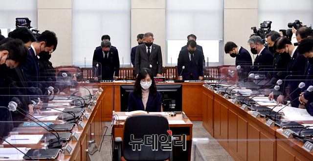 윤희근 경찰청장, 이상민 행정안전부 장관, 남화영 소방청장 직무대리가 1일 국회 행정안전위원회 전체회의 이태원 참사 관련 현안질의에 앞서 묵념하고 있다.