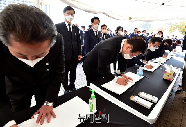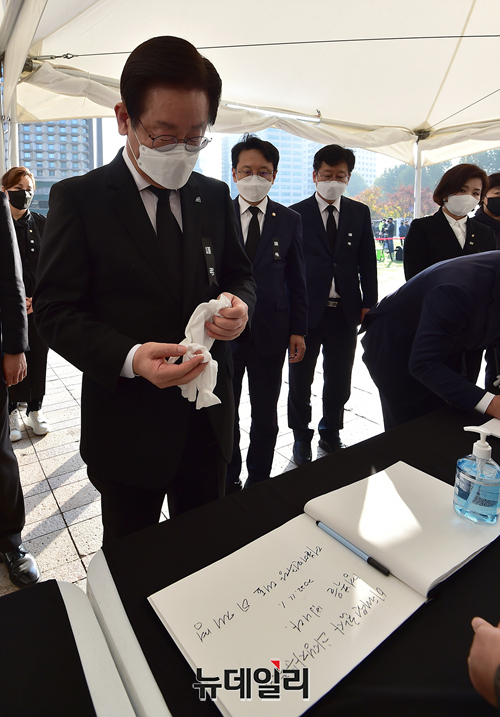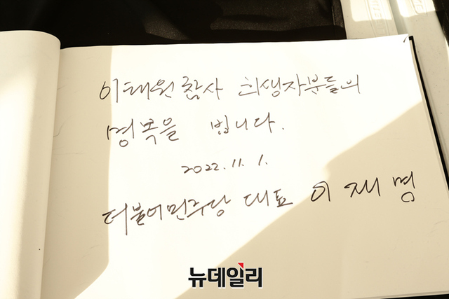 [포토] 서울광장 합동분향소 방명록 작성하는 이재명 대표