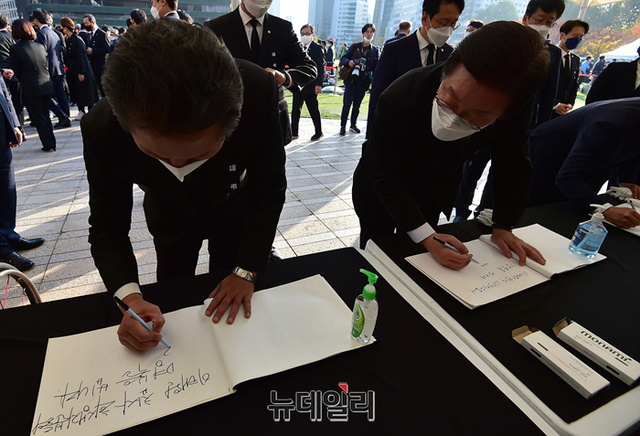 이재명 더불어민주당 대표, 박홍근 원내대표가 1일 오후 서울광장에 마련된 '이태원 사고 사망자 합동분향소'를 찾아 조문 직후 방명록을 작성하고 있다. 이 대표는 "이태원 참사 희생자분들의 명복을 빕니다."라고 방명록을 남겼다.