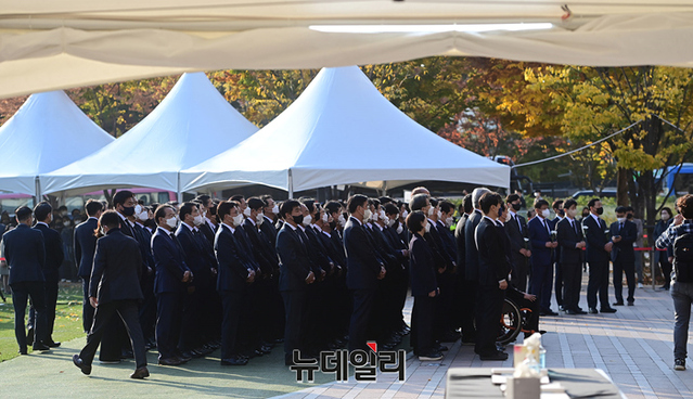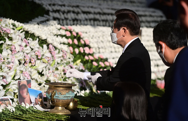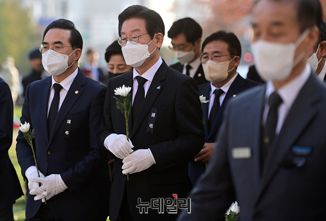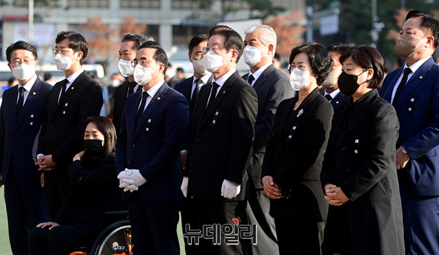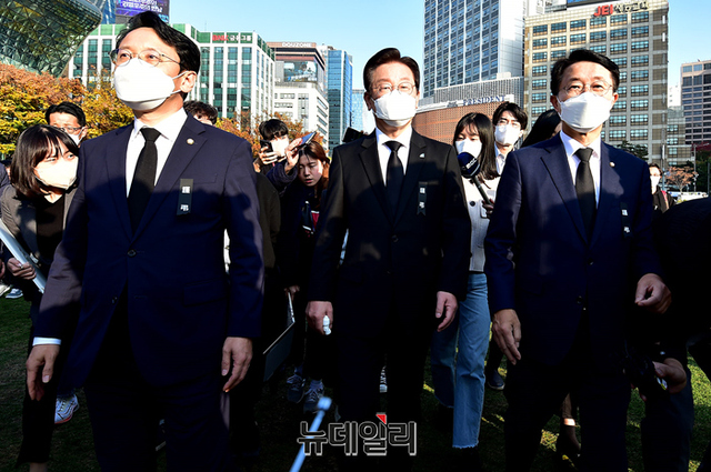 이재명 더불어민주당 대표, 박홍근 원내대표를 비롯한 소속당 의원들이 1일 오후 서울광장에 마련된 '이태원 사고 사망자 합동분향소'를 찾아 조문 하고 있다. 정부는 11월 5일까지 국가 애도기간으로 지정했다.