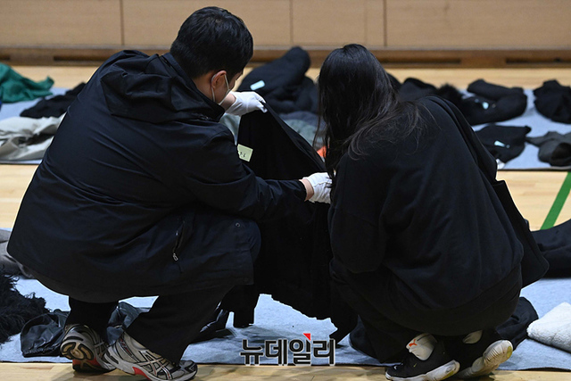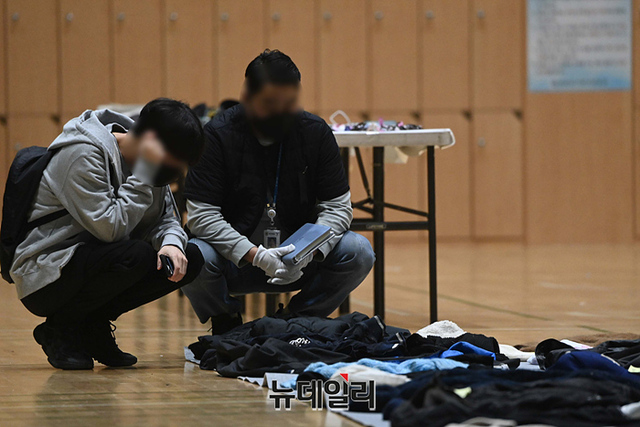 '이태원 압사사고' 관련 희생자의 관계자들이 1일 오후 서울 용산구 다목적 실내체육관에 마련된 유실물센터에서 유류품을 살펴보고 있다.