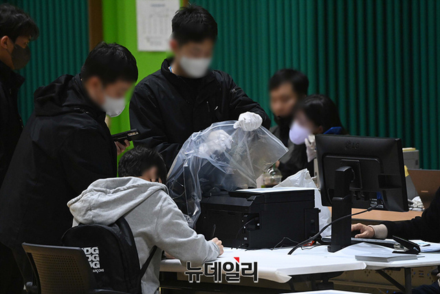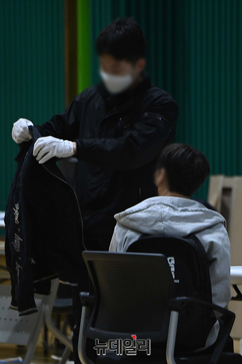 '이태원 압사 사고' 사망자의 관계자가 1일 오후 서울 용산구 원효로 다목적 실내체육관에 마련된 유실물센터에서 유류품을 수령하기 위해 절차를 밟고 있다.