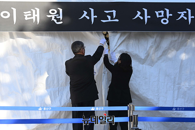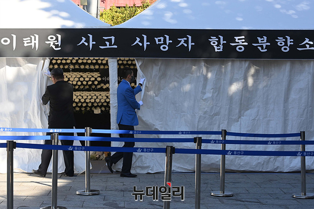용산구청 직원들이 2일 오전 서울 용산구 녹사평역광장에 마련된 이태원 압사 사고 사망자 합동분향소에서 국화를 정리하기 위해 가림막을 치고 있다.