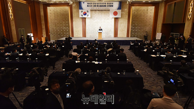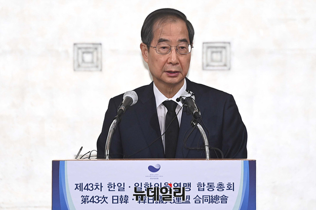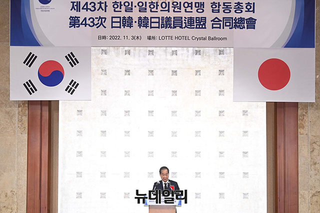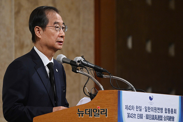 한덕수 국무총리가 3일 오전 서울 중구 롯데호텔에서 진행된 제43차 한일·일한의원연맹 합동총회에서 축사를 하고 있다.