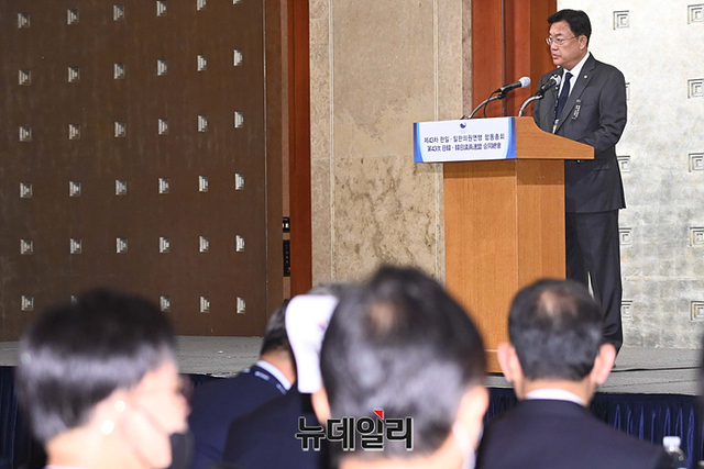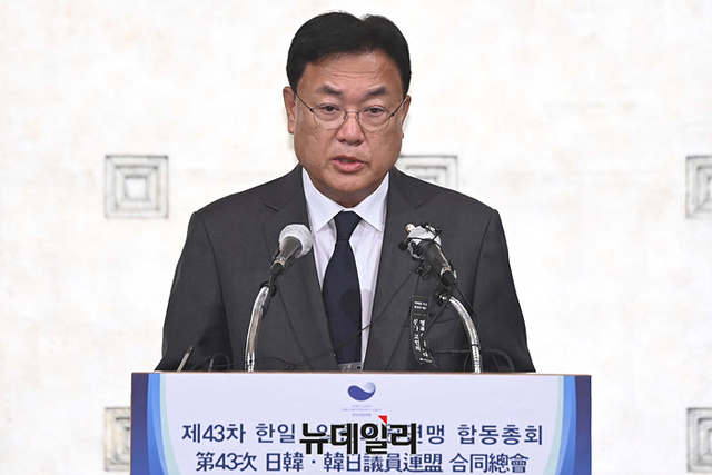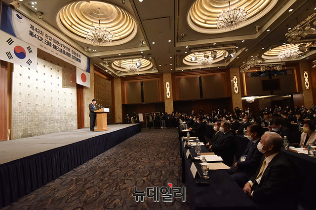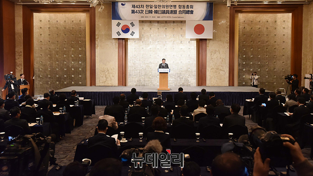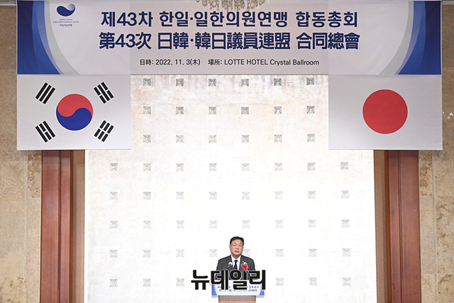 정진석 한일의원연맹 회장이 3일 오전 서울 중구 롯데호텔에서 진행된 제43차 한일·일한의원연맹 합동총회에서 축사를 하고 있다.