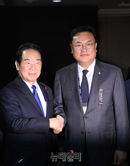 정진석 한일의원연맹 회장(오른쪽)과 '누카가 후쿠시로' 일한의원연맹 회장이 3일 오전 서울 중구 롯데호텔에서 진행된 제43차 한일·일한의원연맹 합동총회에 앞서 악수를 하고 있다.