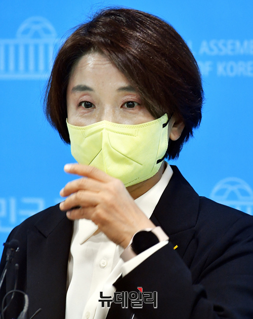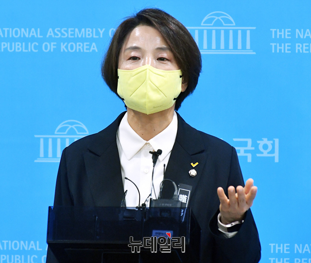 이은주 정의당 원내대표가 3일 국회 소통관에서 기자회견을 갖고 더불어민주당이 추진하는 이태원 사고 국정조사에 찬성 입장을 밝히고 기자들의 질문에 답하고 있다.