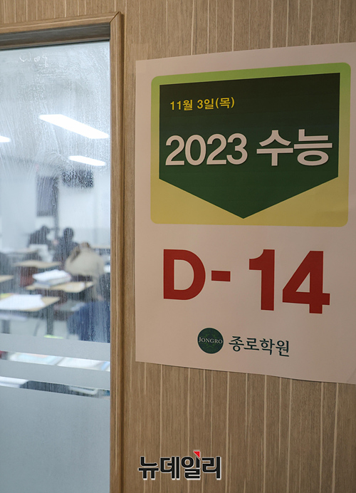 2023년도 대학수학능력시험을 2주 앞두고 있는 3일 오후 서울 마포구 강북종로학원 교실에서 수험생들이 공부를 하고 있다.
