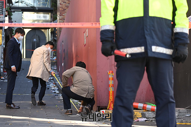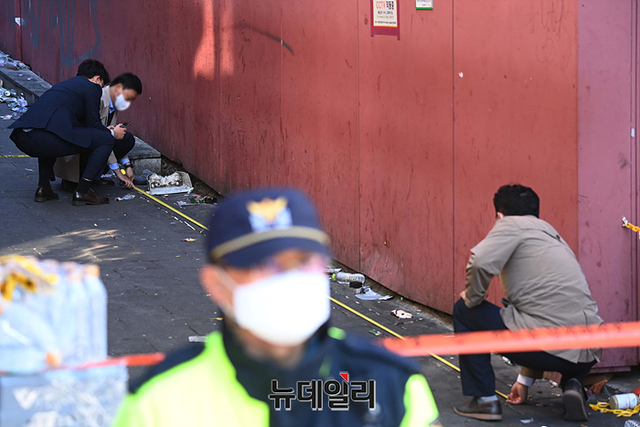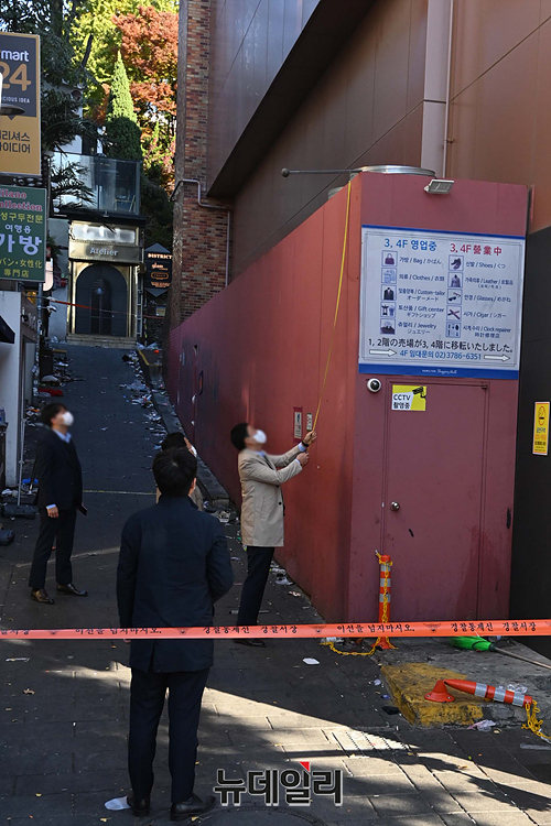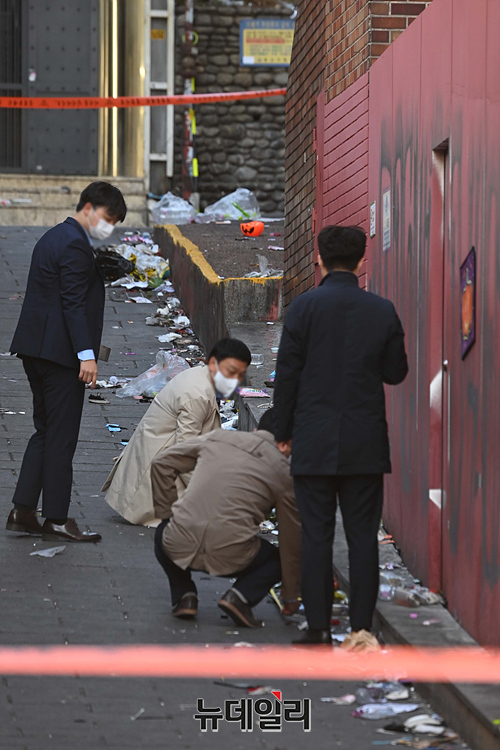 경찰 국가수사본부가 4일 오전 서울 용산구 '이태원 압사 사고' 현장에서 정밀 감식을 하고 있다.