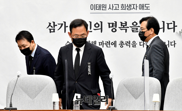 주호영 국민의힘 원내대표 및 원내지도부가 4일 국회에서 열린 원내대책회의에 참석하기 위해 입장하고 있다.
