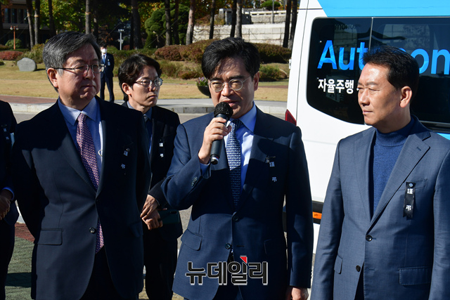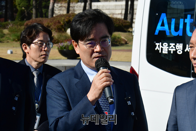 공영운 현대차 사장이 4일 오전 서울 여의도 국회에서 열린 국회사무처·현대자동차 국회 자율주행자동차 도입에 관한 협약식을 마친 뒤 자율주행 셔틀버스 앞에서 발언을 하고 있다.