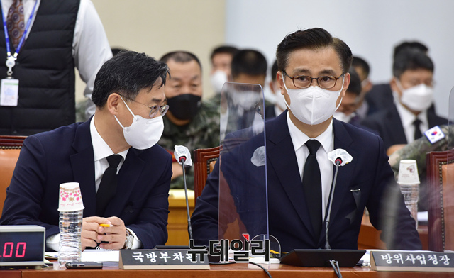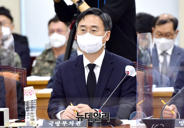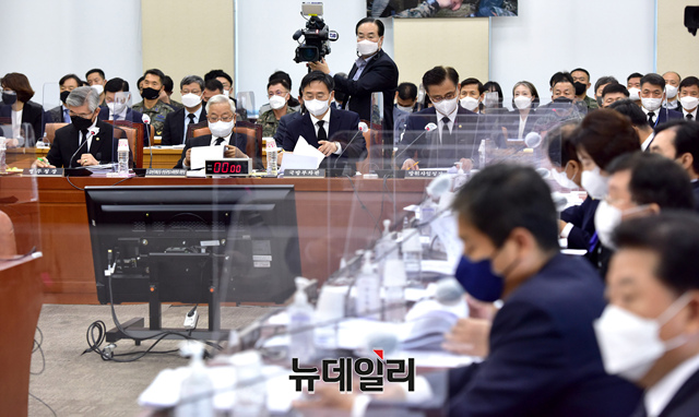 송선태 5·18민주화운동 진상규명조사위원장·신범철 국방부 차관·엄동환 방위사업청장 등이 4일 국회에서 열린 국방위원회 전체회의에서 자리하고 있다.