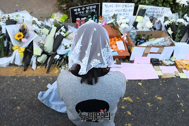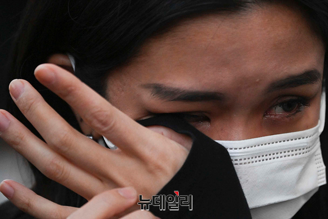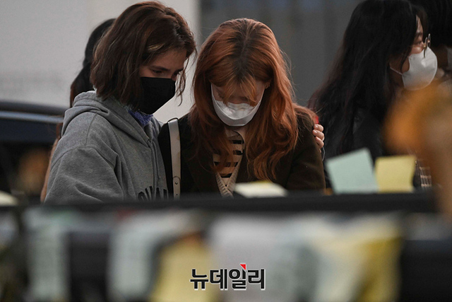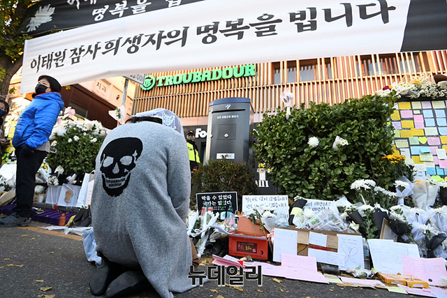 '이태원 압사 사고' 현장에 마련된 추모공간을 찾은 시민들이 4일 오후 사망자를 추모하며 눈물을 훔치고 있다. 정부는 11월 5일까지 국가 애도기간을 지정했다.