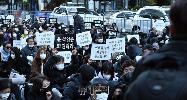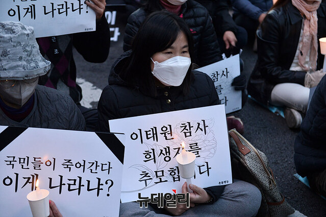 [포토] 이태원 추모 집회에 등장한 '윤석열 퇴진하라'