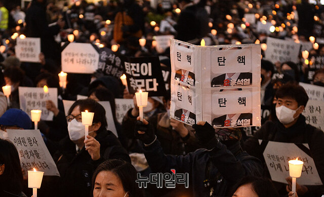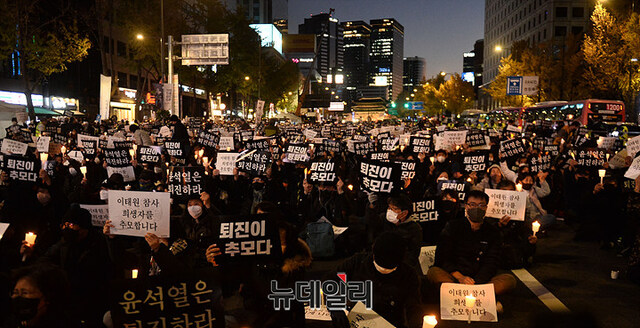 촛불행동 집회 참가자들이 5일 오후 서울 중구 시청역 인근에서 열린 '이태원 참사 희생자 추모 촛불집회'에서 손피켓을 들고 있다.