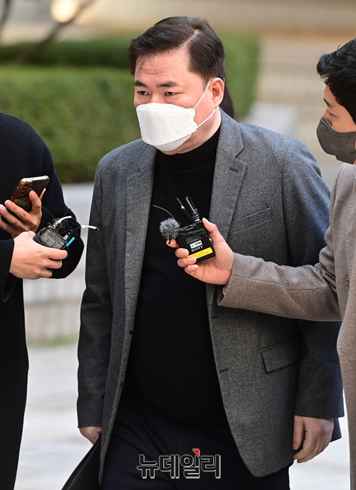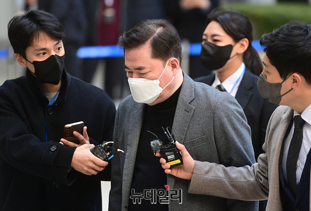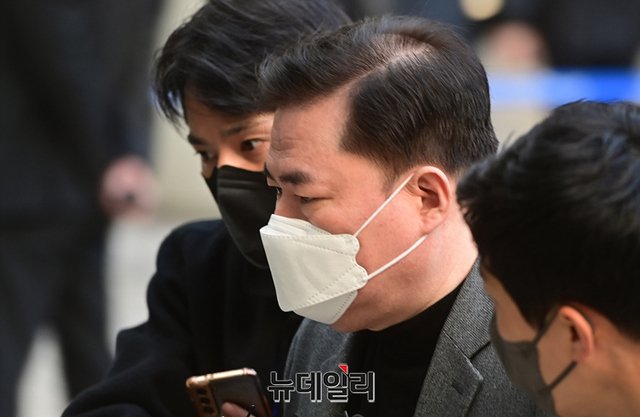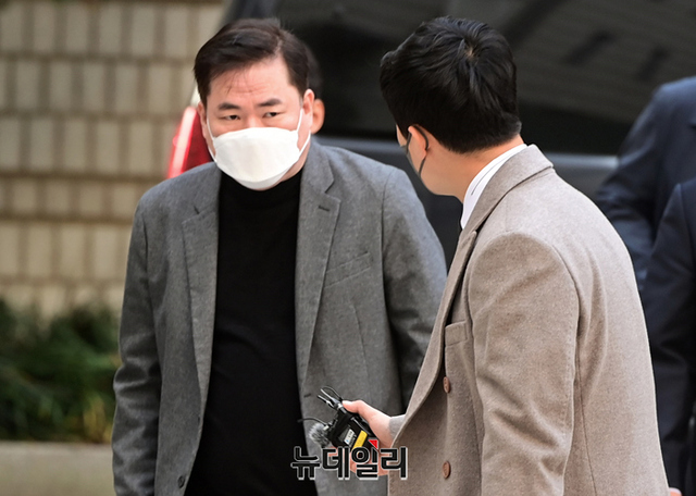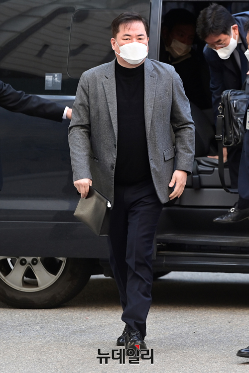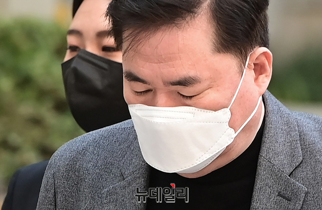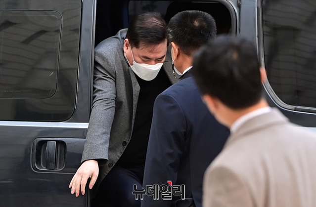 신변보호를 받고 있는 유동규 전 성남도시개발공사 기획본부장이 7일 오전 서울 서초구 중앙지법에서 열린 공판에 출석하고 있다.