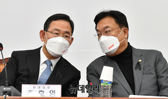 정진석 국민의힘 비대위원장과 주호영 원내대표가 7일 국회에서 열린 비상대책위원회의에 참석해 대화를 나누고 있다.
