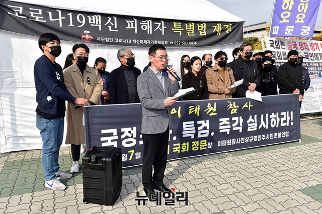개그맨 노정열이 7일 오후 국회의사당 정문에서 이태원참사진상규명민주시민촛불연합이 주최한 이태원 사고 국정조사·특검 촉구 기자회견에서 인사말을 하고 있다.