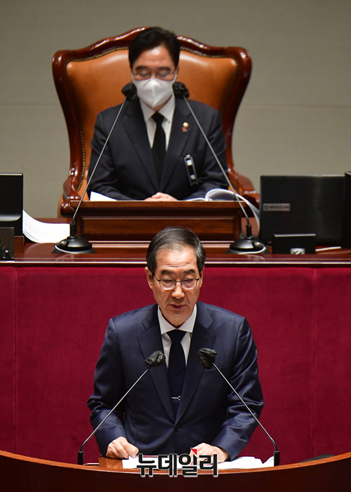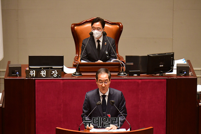 한덕수 국무총리가 7일 국회에서 열린 예산결산특별위원회 전체회의에서 인사말을 하고 있다.