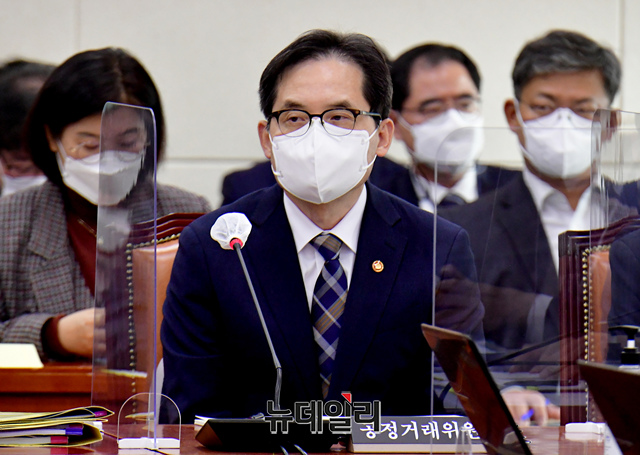 한기정 공정거래위원회 위원장이 8일 오전 국회에서 열린 정무위원회 전체회의에서 의원들 질문을 듣고 있다.