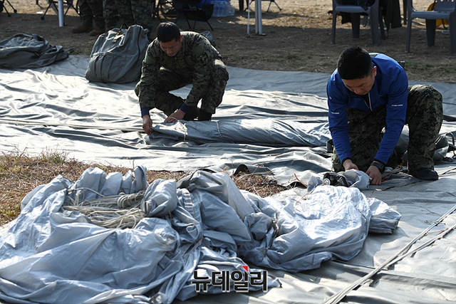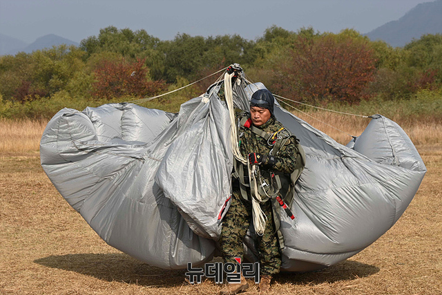 우리군이 8일 오후 경기 하남시 미사리훈련장에서 열린 '제44회 특수전사령관배 고공강하 경연대회'에서 낙하산 장비를 점검하고 있다.'특수전사령관배 고공강하 경연대회'는 항공스포츠 동호회 활동의 저변 확대와 기술 교류는 물론 민군 화합의 장으로 항공레포츠 부문에서 국내 최대 규모의 대회로 자리매김하고 있다.'고공강하'는 1만 피트 이상의 상공에서 낙하해 목표지점에 정확히 착지하는 특전사의 고난도 전투기술이다.'정밀강하'는 4,000피트(1,200m)상공에서 낙하해 착륙지점에 정확하게 착지하는가를 평가하는 종목이다. 총 8라운드 경기를 진행하고 결과를 합산해 최종 우승자를 가린다. (경기 하남=강민석 기자)