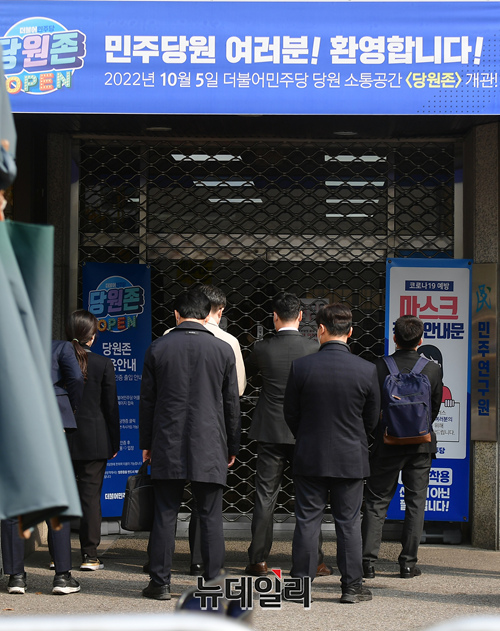 검찰이 이재명 더불어민주당 대표 측근 정진상 당 대표 정무조정실장의 뇌물 등 혐의 관련해 9일 오전 서울 여의도 민주당사에 대한 압수수색을 시도한 가운데 당직자들이 셔터를 내리고 수사관들의 진입을 막고 있다.