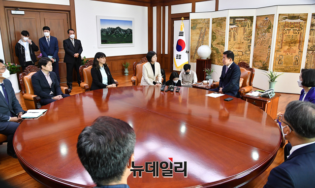 이정미 정의당 대표가 9일 오전 국회 의장실에서 김진표 국회의장을 예방하고 환담을 나누고 있다.