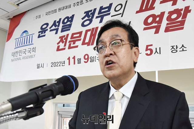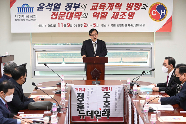 정훈 포럼희망전문대학 의장이 9일 오후 국회 의원회관에서 열린 '윤석열 정부의 교육개혁 방향과 전문대학의 역할 재조명' 세미나에서 개회사를 하고 있다.