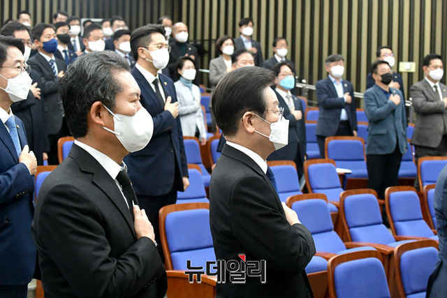 이재명 더불어민주당 대표 및 의원들이 9일 국회에서 열린 정책의원총회에서 국민의례를 하고 있다.