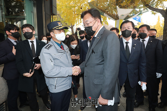 정진석 국민의힘 비상대책위원장(오른쪽)이 9일 오후 서울 용산구 녹사평역광장에 마련된 이태원 압사 사고 사망자 합동분향소에서 조문을 마친 뒤 임현규 용산경찰서장과 악수를 하고 있다. (사진=공동취재단)