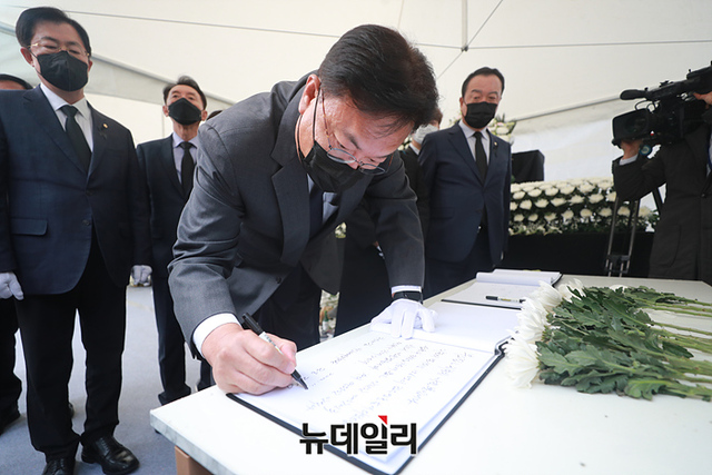 정 비대위원장은 "부끄럽고 죄송한 마음뿐입니다. 하늘의 별이 되신 156명의 젊은 영혼 앞에 다짐드립니다. 슬픔과 회환을 가슴에 품고 안전한 대한민국 반드시 만들겠습니다. 부디 영원한 안식과 평화가 함께 하소서"라고 방명록을 남겼다. (사진=공동취재단)