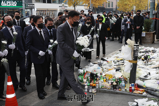 정진석 국민의힘 비상대책위원장이 9일 오후 서울 용산구 '이태원 압사 사고' 현장에 마련된 추모공간에서 헌화를 하고 있다. (사진=공동취재단)