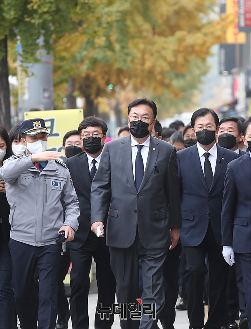 정진석 국민의힘 비상대책위원장을 비롯한 당 소속 의원들이 9일 오후 서울 용산구 '이태원 압사 사고' 현장에 마련된 추모공간으로 이동하고 있다. (사진=공동취재단)