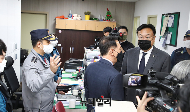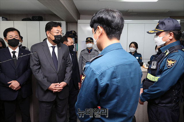 정진석 국민의힘 비상대책위원장이 9일 오후 서울 용산구 이태원파출소를 방문해 경찰관들을 격려하고 있다. (사진=공동취재단)