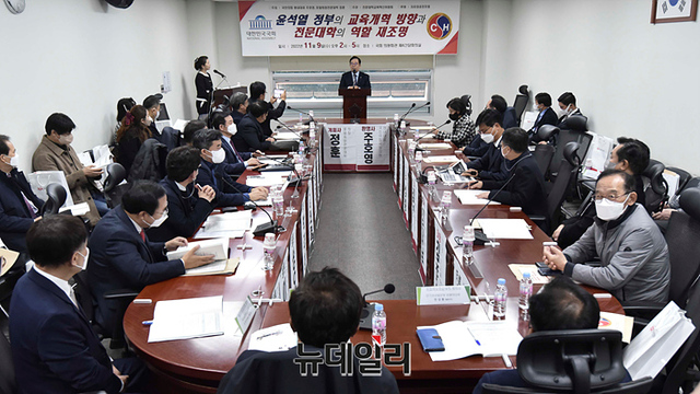 박성중 국민의힘 의원이 9일 오후 국회 의원회관에서 열린 '윤석열 정부의 교육개혁 방향과 전문대학의 역할 재조명' 세미나에서 축사를 하고 있다.