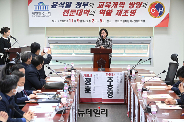 이인선 국민의힘 의원이 9일 오후 국회 의원회관에서 열린 '윤석열 정부의 교육개혁 방향과 전문대학의 역할 재조명' 세미나에서 축사를 하고 있다.
