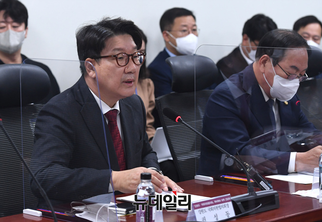 권성동 강원도 국회의원협의회 회장이 10일 오전 국회 의원회관에서 열린 ‘강원도·국회의원협의회 국비확보 대책회의’에서 모두발언을 하고 있다.